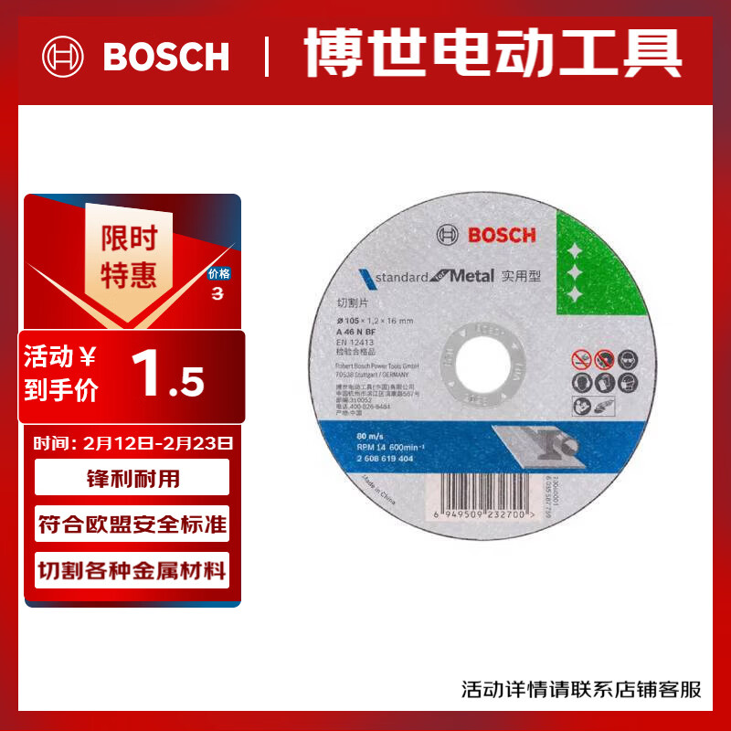 博世(BOSCH)角磨机切割片金属磨切片钢管钢筋切割105x1.2mm实用系列(1片装)