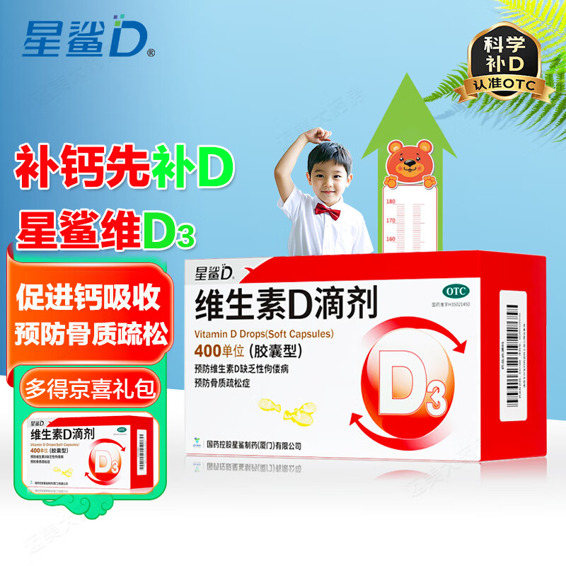 [星鲨]维生素D滴剂 400IU*72粒 1盒装 星鲨Vd3婴幼儿儿童补充维生素D3促钙吸收补钙国药准字OTC星鲨D3 ZDM