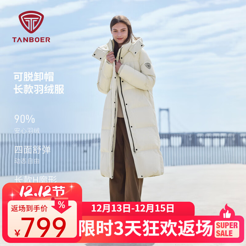坦博尔(Tanboer)长款羽绒服女过膝可脱卸帽冬天保暖加厚外套TBF550836T 岩石白 M (165)