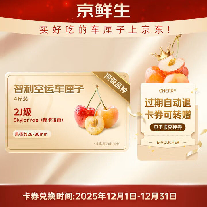 京鲜生 智利进口车厘子2J级5斤礼盒装 果径约28-30mm 水果年货礼盒