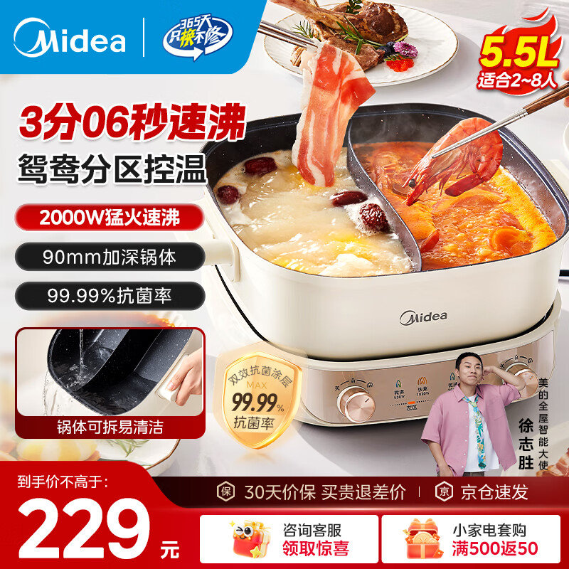 美的(Midea)速沸电火锅 分区控温鸳鸯锅 电煮锅火锅专用锅电锅火锅锅多功能锅分体式家用电热锅多用途锅 5.5L 分区控制分体鸳鸯锅 HGS282813