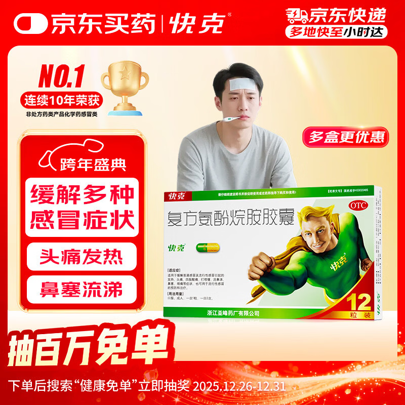 快克 复方氨酚烷胺胶囊12粒 流感药 感冒咳嗽 头痛发热 鼻塞流涕打喷嚏 咽痛 抗病毒用药 家庭常备药