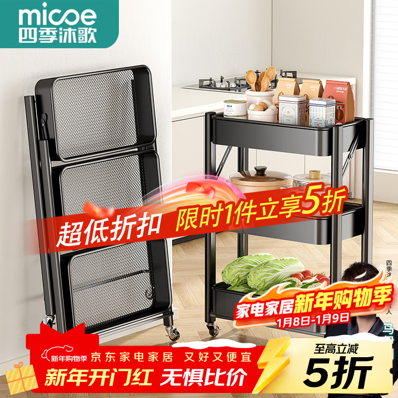 四季沐歌厨房置物架落地折叠小推车置物架免安装零食收纳储物移动果蔬菜篮 3层耀黑【可折叠】常规款