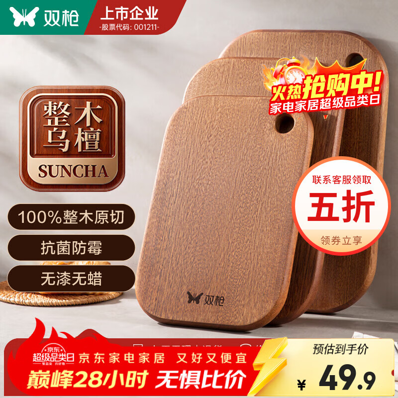 双枪乌檀木整木菜板家用抗菌防霉小案板实木切菜板婴儿水果砧板辅食板 【适用1-2人】小号30*20*2cm(整木加厚)