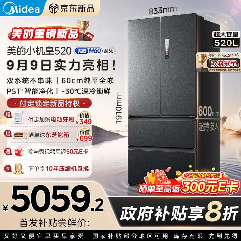 美的(Midea)M60系列520纯平全嵌法式多门四开门家用冰箱超薄嵌入双系统循环大容量家用冰箱BCD-520WUFPZM(E)