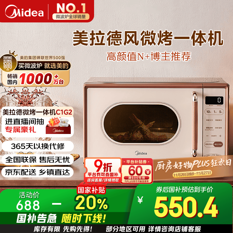 美的(Midea)小滋味微波炉烤箱一体机小型家用微波炉光波加热一级能效平板变频复古美拉德风C1G2