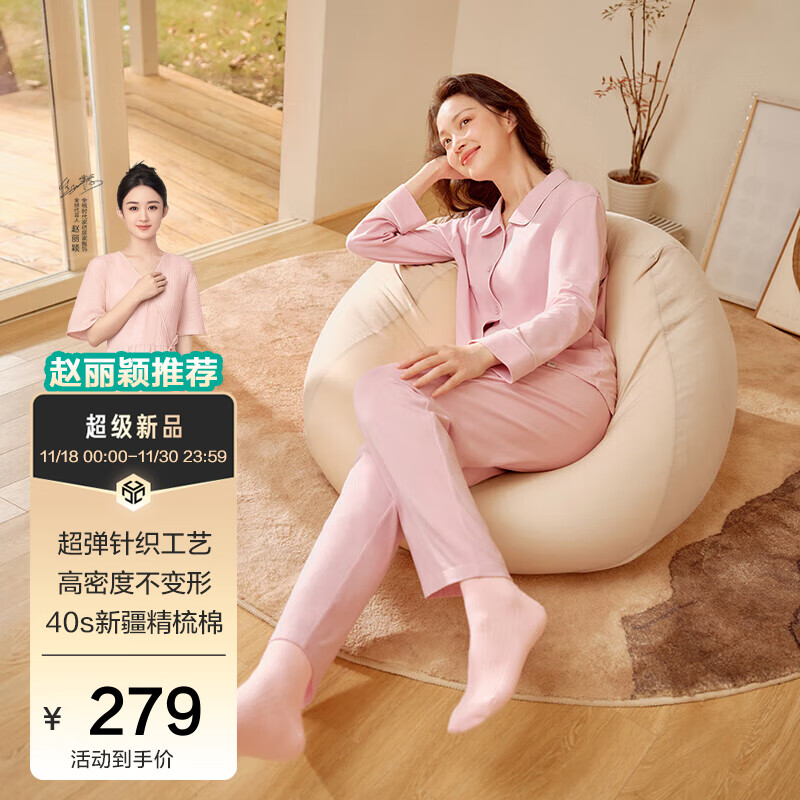 全棉时代睡衣女长袖长裤情侣家居服套装针织 杏桃粉 XXL