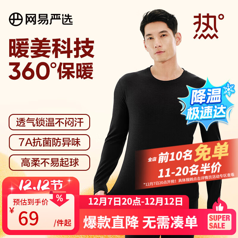 网易严选新品暖姜保暖内衣240g重磅7A抗菌柔软透气不闷汗秋衣秋裤 B款230g-水墨黑-男 L