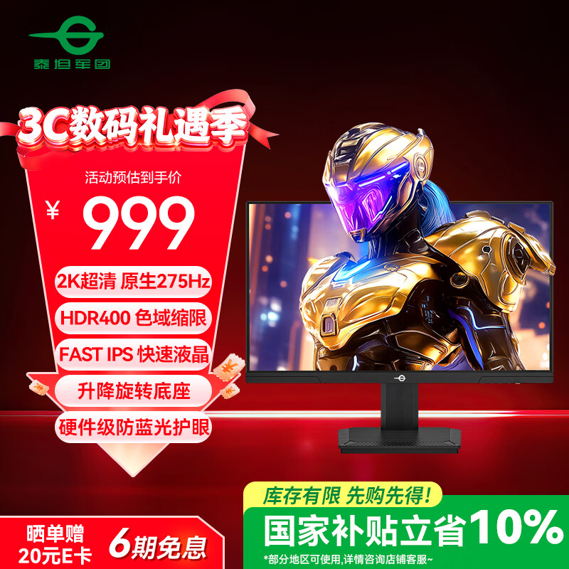 泰坦军团24.5英寸2K 原生275Hz FastIPS HDR400硬件低蓝光 出厂校色 人体工学升降支架 电竞显示器 P2512S+