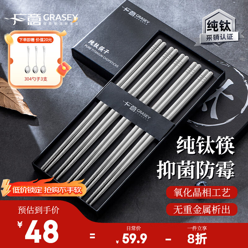 广意99.5%纯钛筷子 家用高档金属筷钛质中空防烫防滑轻量便携餐具套装 【99.5%纯钛】六环纯钛筷5双装