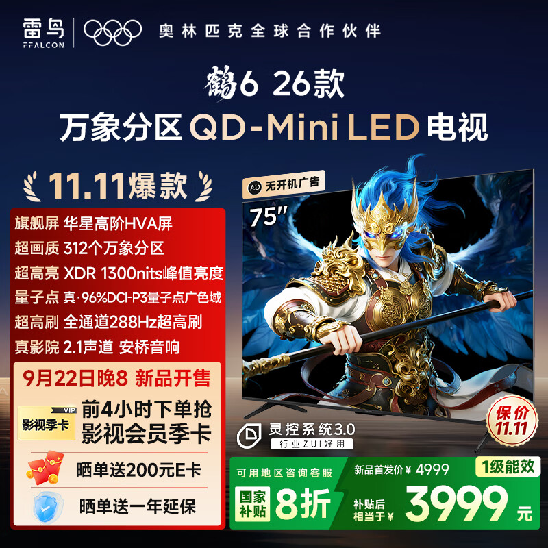 FFALCON雷鸟电视鹤6 26款 75英寸 万象分区QD-MiniLED1300nits 高阶HVA安桥音响288Hz高刷 【11.11爆款】