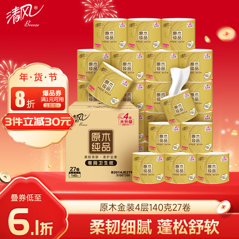 自营清风【李昀锐同款】有芯卷纸原木金装 4层加厚140克*27卷 卫生纸 整箱
