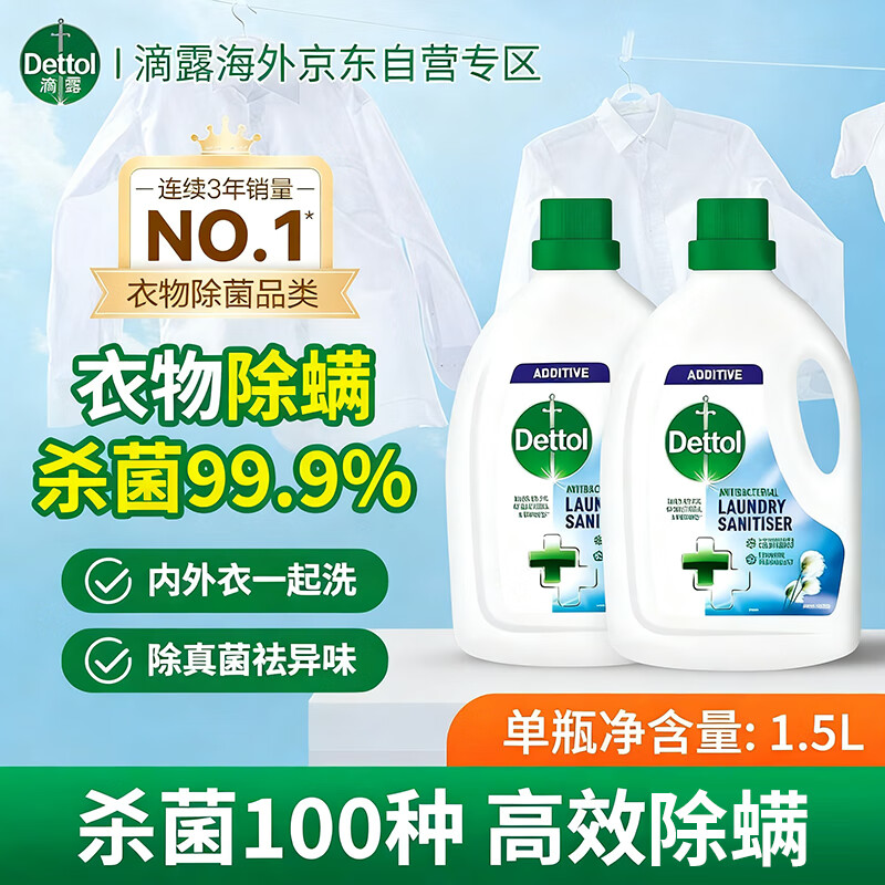 自营滴露(Dettol)衣物除菌液 杀菌99.9% 高效除螨 可配消毒液洗衣液使用 1.5L *2
