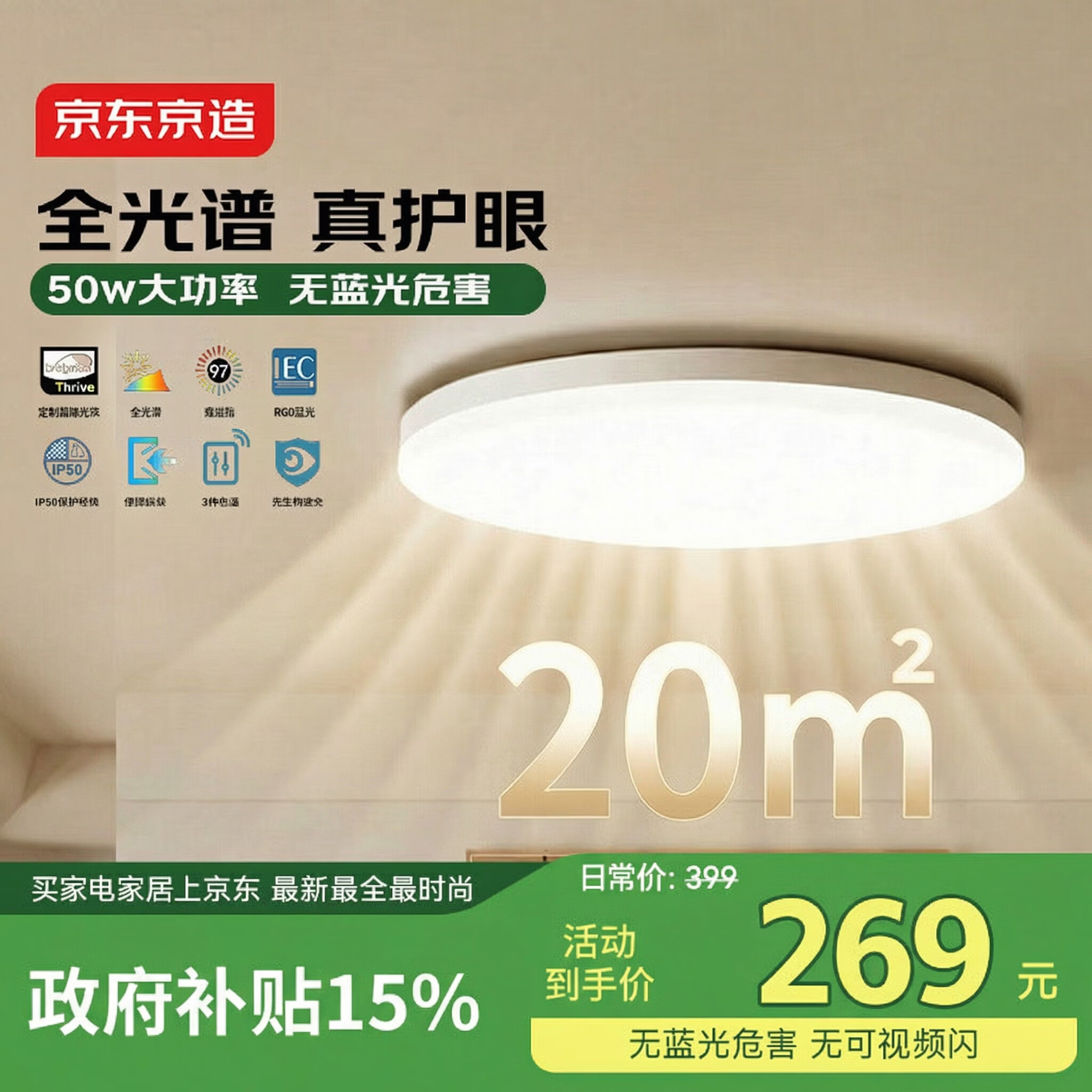 自营京东京造E1吸顶灯 50W简约卧室灯全光谱护眼灯 无蓝光危害3种色温 包安装