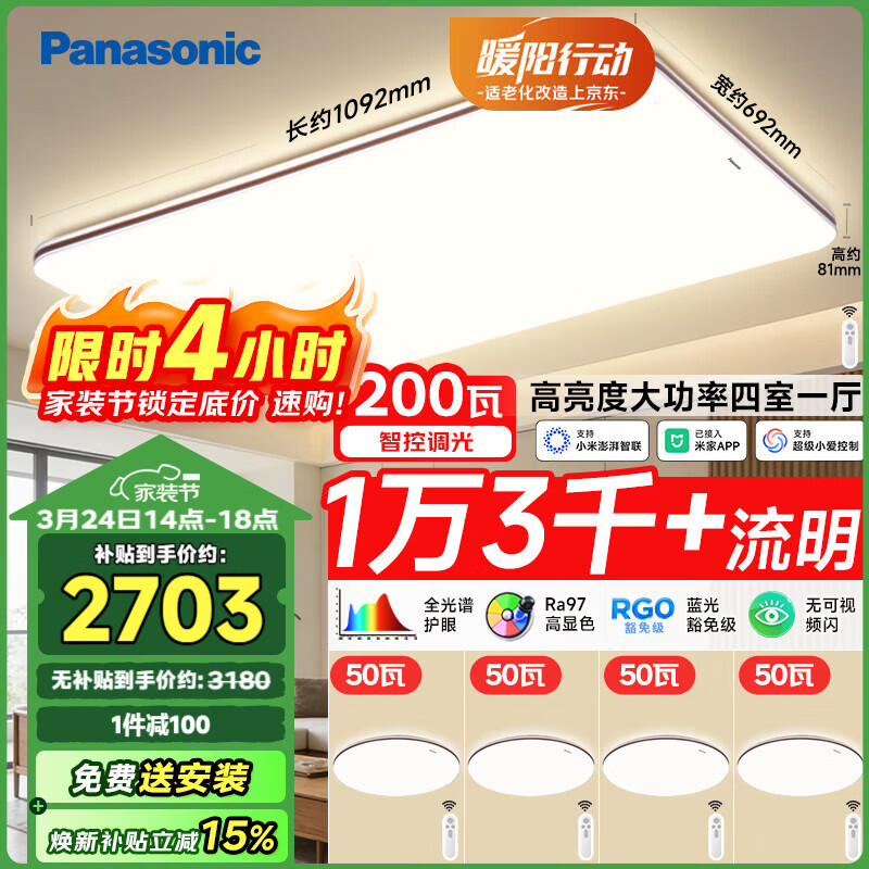 自营松下(Panasonic)吸顶灯全光谱护眼大功率200W超薄松畔智能四室一厅【包安装】