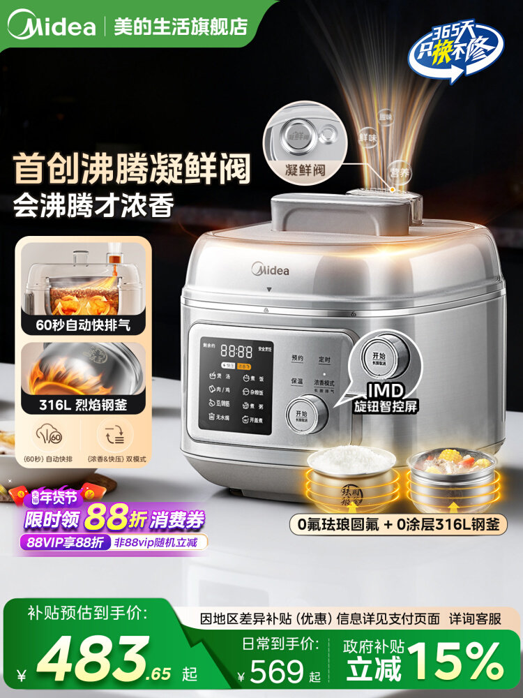 旗舰店美的0氟0涂层电压力锅家用316不锈钢电高压锅换新补贴电饭煲新款