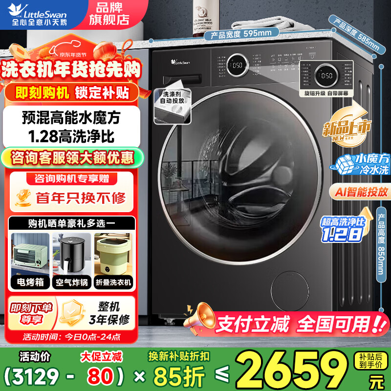 旗舰店小天鹅(LittleSwan)滚筒洗衣机 水魔方全自动 家用大容量纯平自由嵌内衣洗1.28高洗净比 净屑除毛 以旧换新 1.28高洗净比丨羊毛绿标丨628plus 单洗