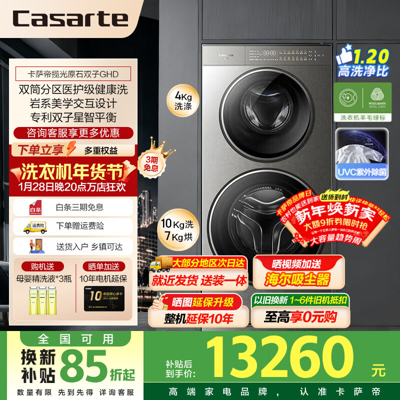 旗舰店卡萨帝双子洗衣机洗烘一体14公斤子母一体机揽光LB/原石分区洗衣机滚筒带烘干一体紫外除菌 双智能投放 原石HD 洗烘一体 丨活水精华洗+养护湿洗+羊毛绿标