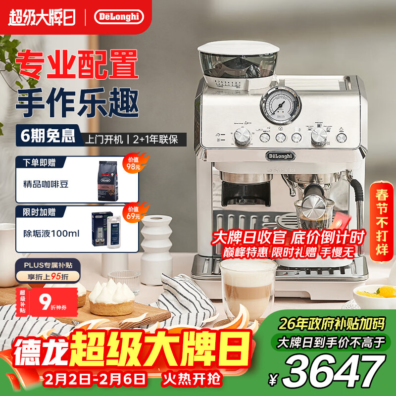 自营德龙(Delonghi)咖啡机 半自动咖啡机银骑士 意式美式家用现磨研磨一体机小型 手动打奶泡 EC9155.W 白色新年礼物