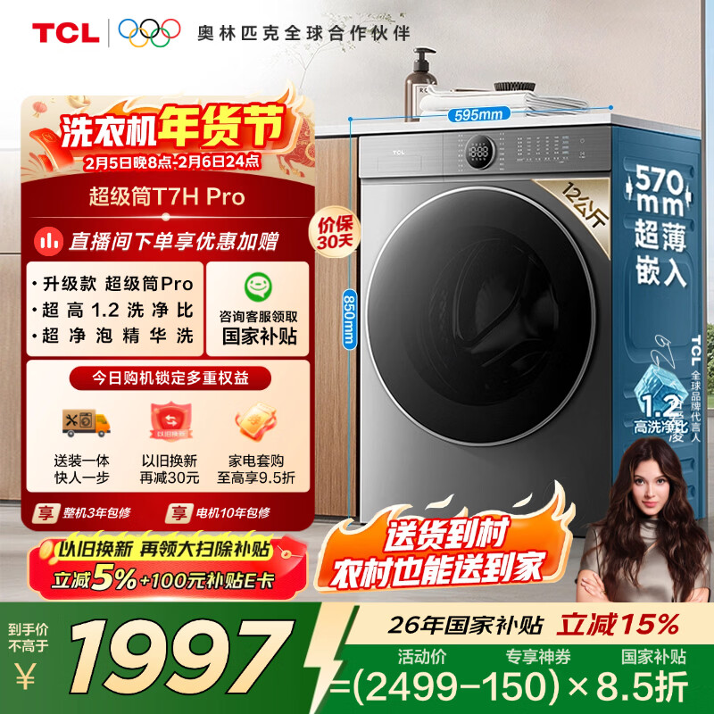自营TCL 超级筒T7H Pro滚筒单洗12KG洗衣机全自动家用家电国家补贴以旧换新1.2洗净比G120T7H-DIS