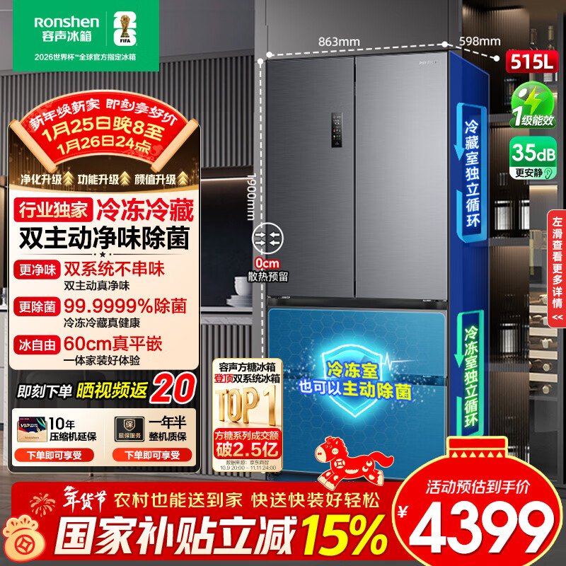 旗舰店容声方糖515L法式多门冰箱双系统主动除菌超薄零嵌入式一级能效无霜大容量灰BCD-515P60FZMAD国家补贴 515法式【双系统不串味+超薄零嵌】
