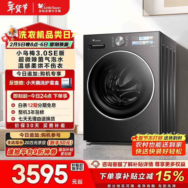 自营小天鹅(LittleSwan)小乌梅3.0高奢版 滚筒洗衣机全自动 12KG纯平大容量 TG12VE40PRO 以旧换新 国家补贴 京东自营