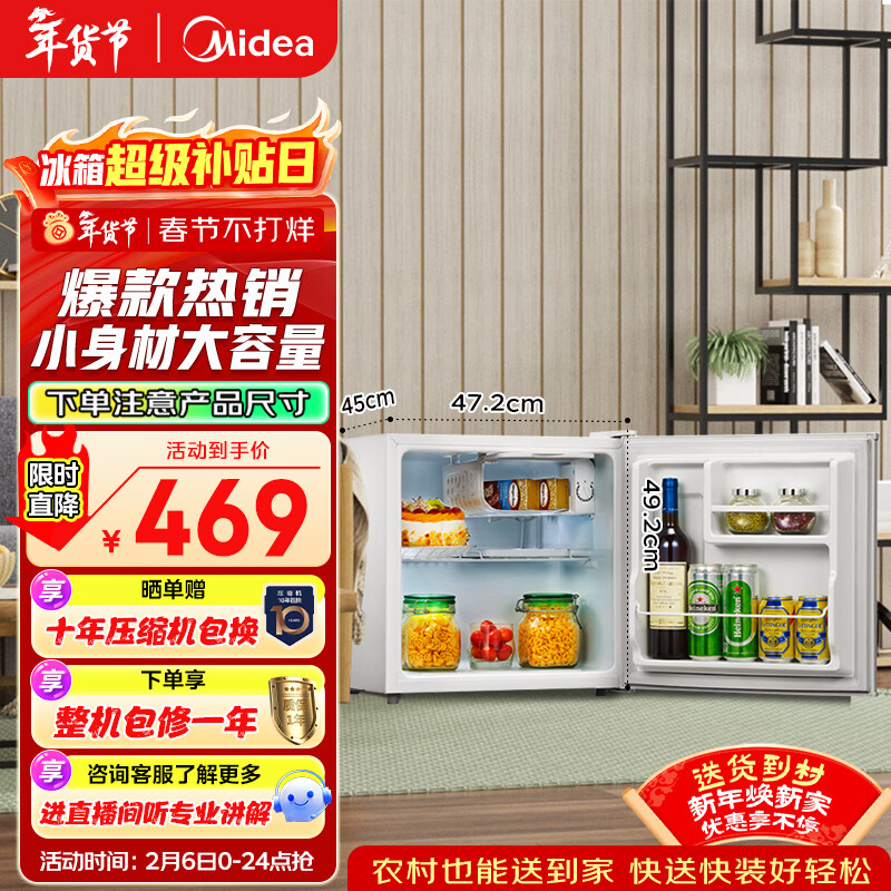 自营美的(Midea)45L单门小冰箱白色迷你租房宿舍办公室家用单温冷藏小型电冰箱美妆可用节能运行BC-45M