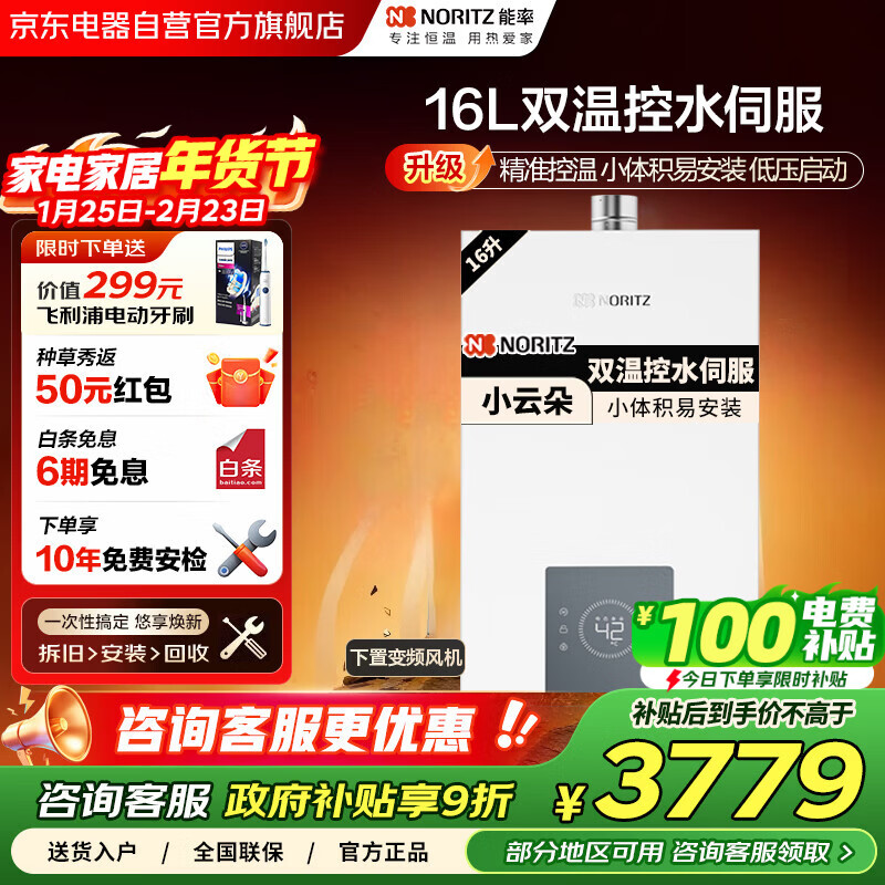 自营能率(NORITZ)16升小云朵燃气热水器 天然气变频水伺服恒温下置风机静音 JSQ31-EP3A