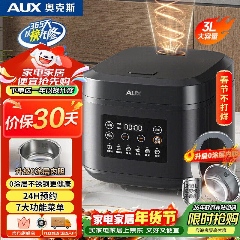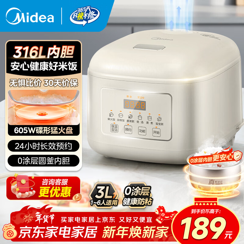 旗舰店美的(Midea)电饭煲电饭锅家用商用柴火饭多功能预约小型迷你煮饭2-3-5-8人大容量不锈钢内胆不易粘锅年货好物 0涂层 3L 母婴级316L不锈钢内胆卡其灰偏白