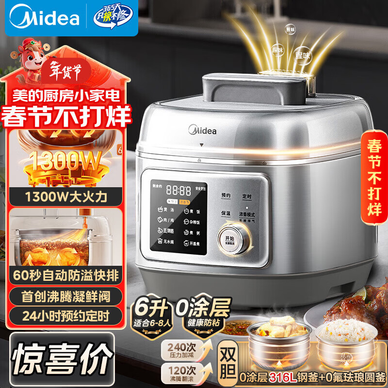 自营美的(Midea)【送礼好年货】凝鲜浓香电压力锅0氟珐琅釜316L钢釜0涂层6L高压锅快排家用煲汤6-10人煮饭煲C6940N