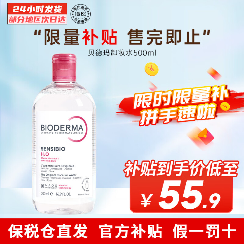 贝德玛(BIODERMA)网红大粉水蓝水卸妆水 多效温和清洁眼唇脸三合一卸妆 粉水500ml【敏感肌适用】