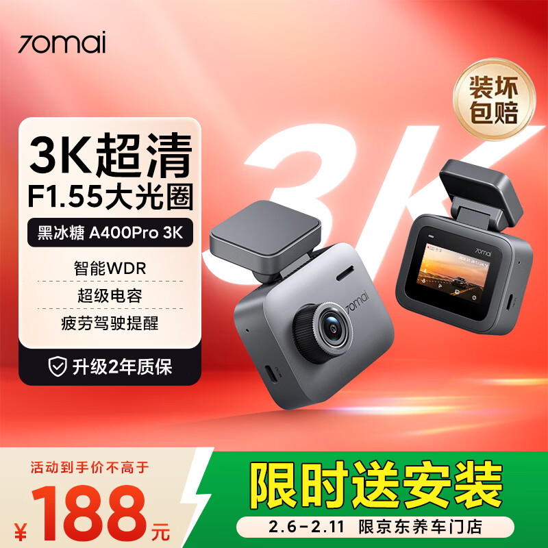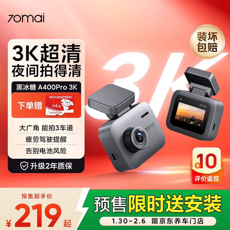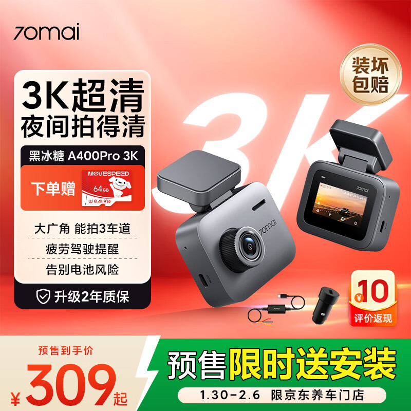自营70迈 70MAI黑冰糖A400Pro 3K行车记录仪超高清夜视 64G卡+停车监控线