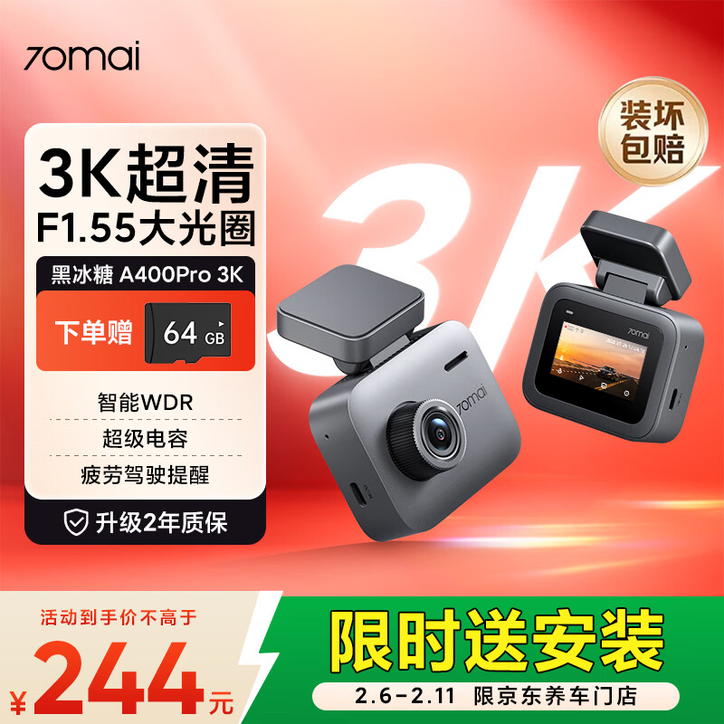 自营70迈 70MAI黑冰糖A400Pro 3K行车记录仪超高清夜视 64G卡+停车监控线