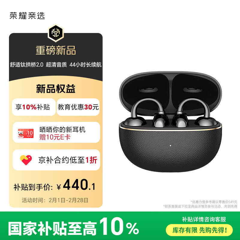 自营荣耀亲选耳夹式耳机2 Pro【国家补贴】明星同款荣耀耳机蓝牙耳机clip舒适佩戴长续航高音质通话降噪典雅黑