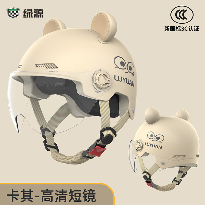 百亿补贴绿源(Luyuan)电动车头盔电瓶车3c认证摩托车头盔女男通用四季盔半盔防晒安全帽 【耳朵款】卡其色-透明短镜 【不带护耳】