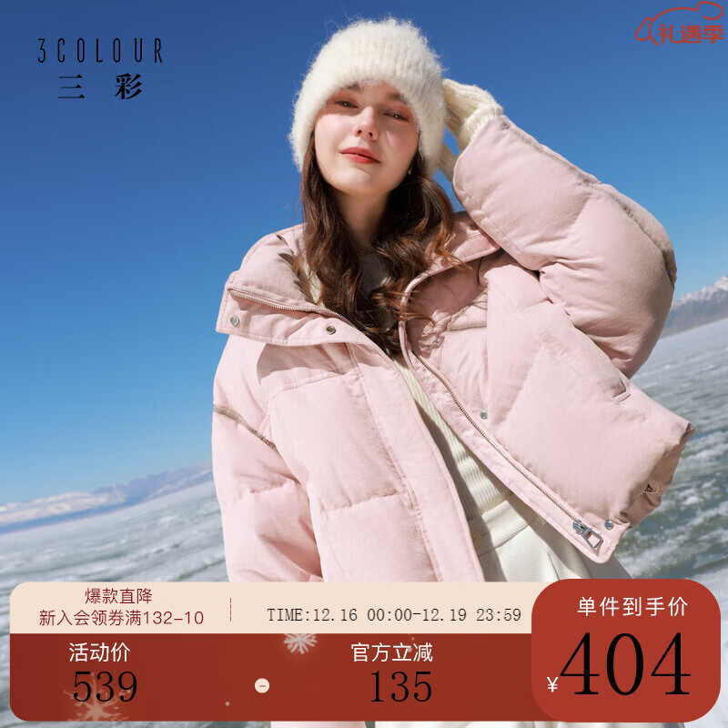 旗舰店三彩2025冬季新款立领羽绒服蓄热90白鸭绒短款面包服M 浅粉 L 165/88A