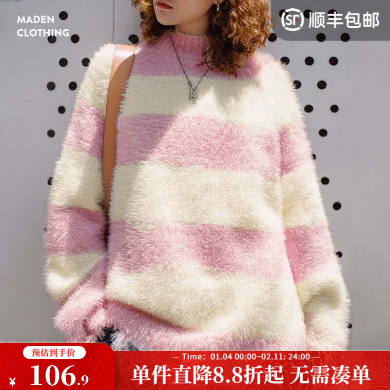 旗舰店马登粉白宽条纹针织衫女蓬松软糯半高领女士套头毛衣秋冬宽松毛织外套 樱花粉 +米白 撞色条纹 M