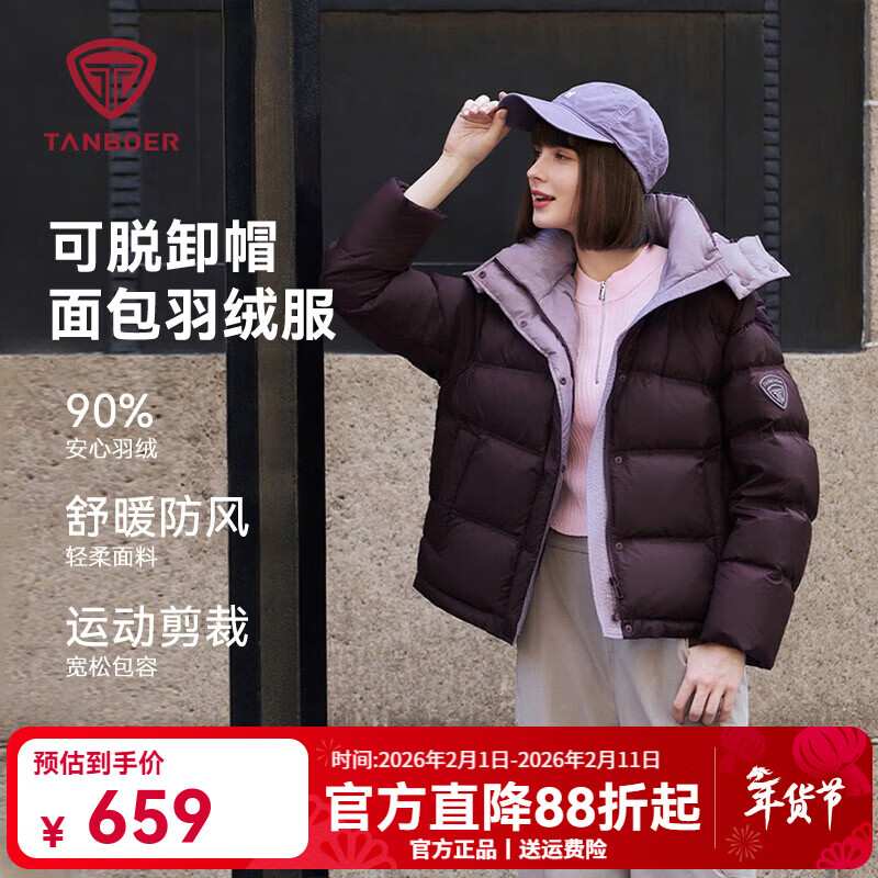 旗舰店坦博尔2025冬季新款休闲百搭可脱卸帽面包羽绒服女短款加厚保暖外套 满天星紫 S (160) 建议体重110斤-120斤