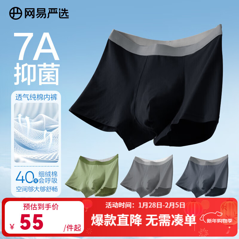旗舰店网易严选 男式7A全裤抑菌棉质透气平角男士内裤高弹舒适 A款7A抑菌-黑色+深灰+深绿+浅灰 4条 2XL