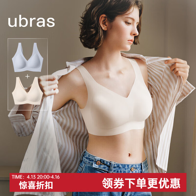 旗舰店ubras【2件装】无尺码免拆V领内衣女背心美背粉底液色文胸罩无痕隐形 奶盐蓝+燕麦奶
