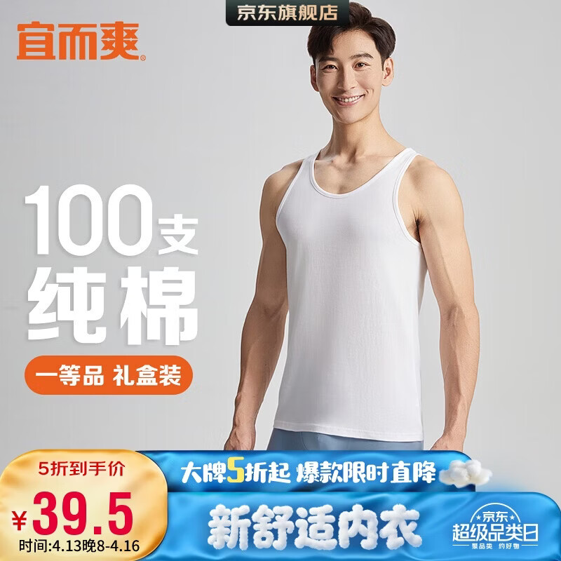 自营宜而爽【高档100支】100%纯棉背心男士运动休闲宽松打底汗衫男送礼盒装