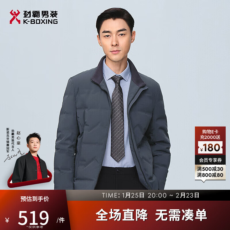 自营劲霸男装(K-Boxing)男士冬季立领轻薄短款夹克羽绒服|NRHG4002 灰色 180/XL