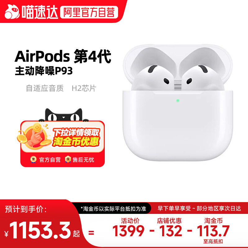 自营【阿里自营】Apple/苹果AirPods4主动降噪苹果蓝牙耳机P93