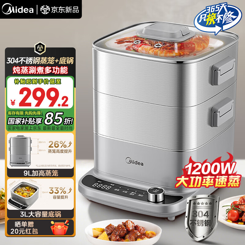 旗舰店美的(Midea)Mini蒸魔方多功能电蒸锅家用 炖蒸涮煮一体3层 大容量 不锈钢可拆洗 24H智能预约和6H保温 12L 【食品级304不锈钢】
