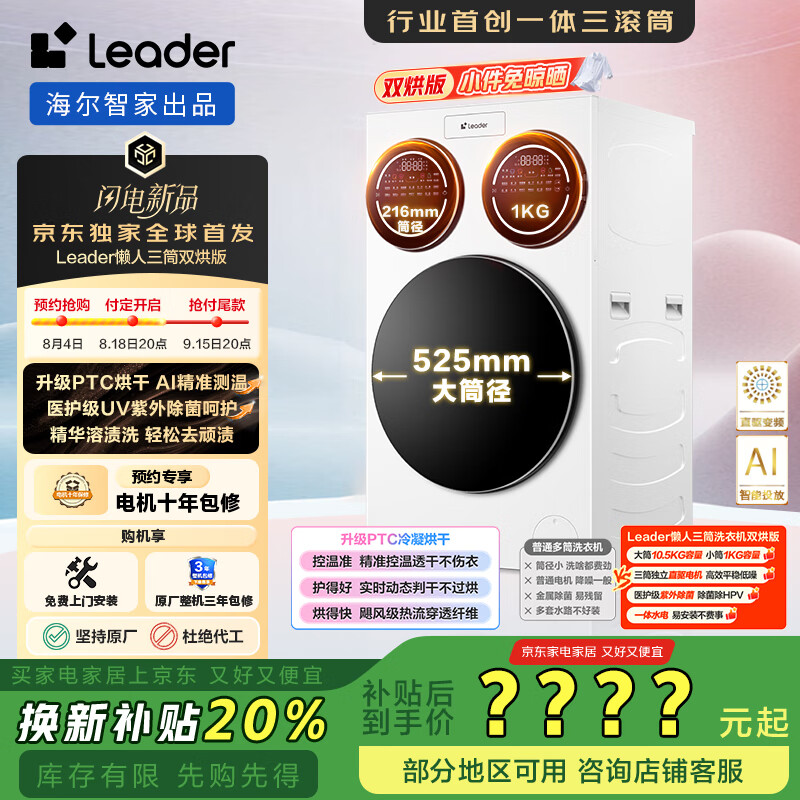 自营统帅(Leader)海尔智家【京东全球独家首发】懒人三筒洗衣机双烘版 12.5公斤 XQGL125-MHBLDE697WU1三桶许愿换新