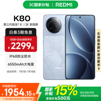 旗舰店小米REDMI 红米K80 国家补贴 5G手机 第三代骁龙8 IP68防尘防水 6550mAh大电池 小米澎湃OS 汐月蓝 12GB+256GB