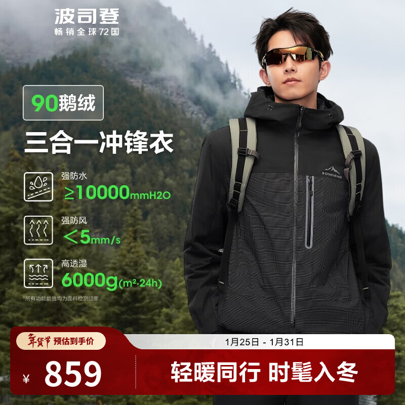 旗舰店波司登(BOSIDENG)【断码清仓】冲锋衣鹅绒羽绒服男女情侣款90绒三合一防风防雨外套 银黑细格 黑色896A XS 155/80A