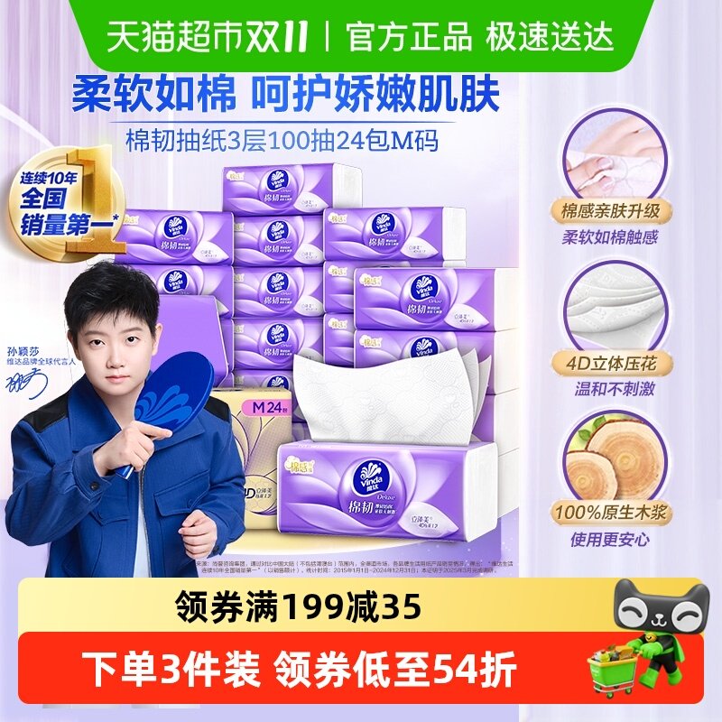 自营维达(Vinda)抽纸【孙颖莎推荐】棉韧3层100抽*36包S码 亲肤无刺激纸巾 AB混发