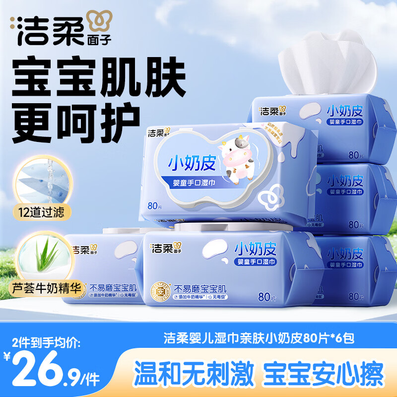 自营洁柔婴儿湿巾亲肤小奶皮80抽*6包湿纸巾婴儿手口屁专用儿口手口湿巾