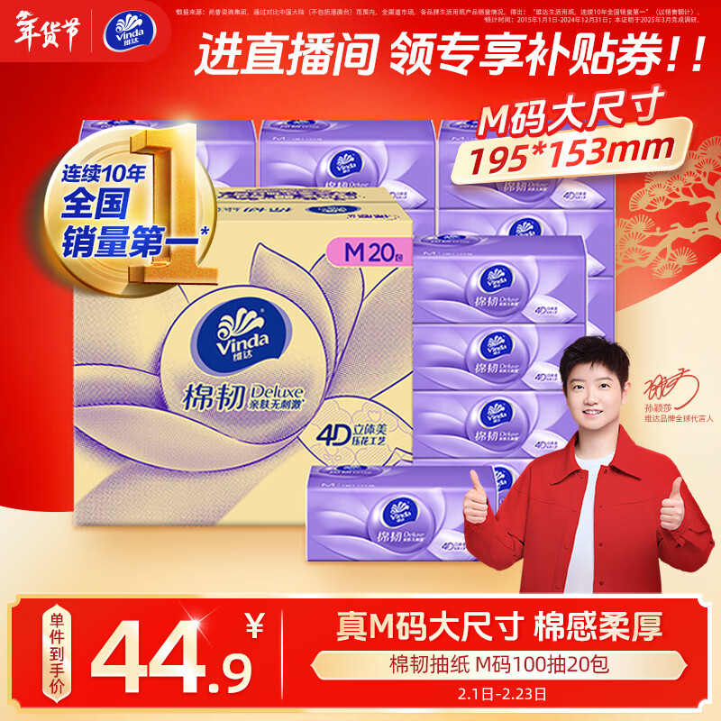 【孙颖莎推荐】维达棉韧立体美压花抽纸M码纸巾卫生纸家用实惠整